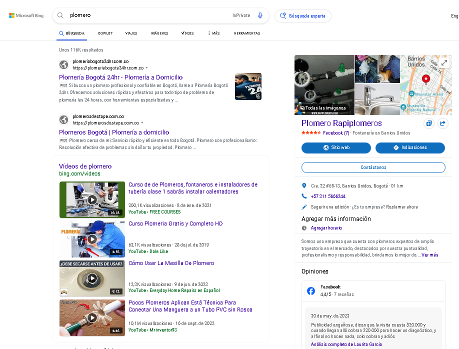 "Desde que lanzamos la página web hace seis meses, hemos visto un crecimiento increíble. Ahora estamos en la 1.ª posición en Bing para las palabras clave más importantes como 'plomero', 'plomero Bogotá' y 'plomeros en Bogotá'. También estamos en el top 5 para todos nuestros servicios. Este posicionamiento ha sido clave para incrementar nuestra visibilidad en línea y atraer más clientes de toda la ciudad. La estrategia digital ha sido esencial para lograr estos resultados, y no podríamos estar más contentos con el impacto que ha tenido en nuestro negocio. – Cesar Augusto Serna, Plomero a cargo de Plomería Bogotá 24hr Teléfono: 310 328 6990